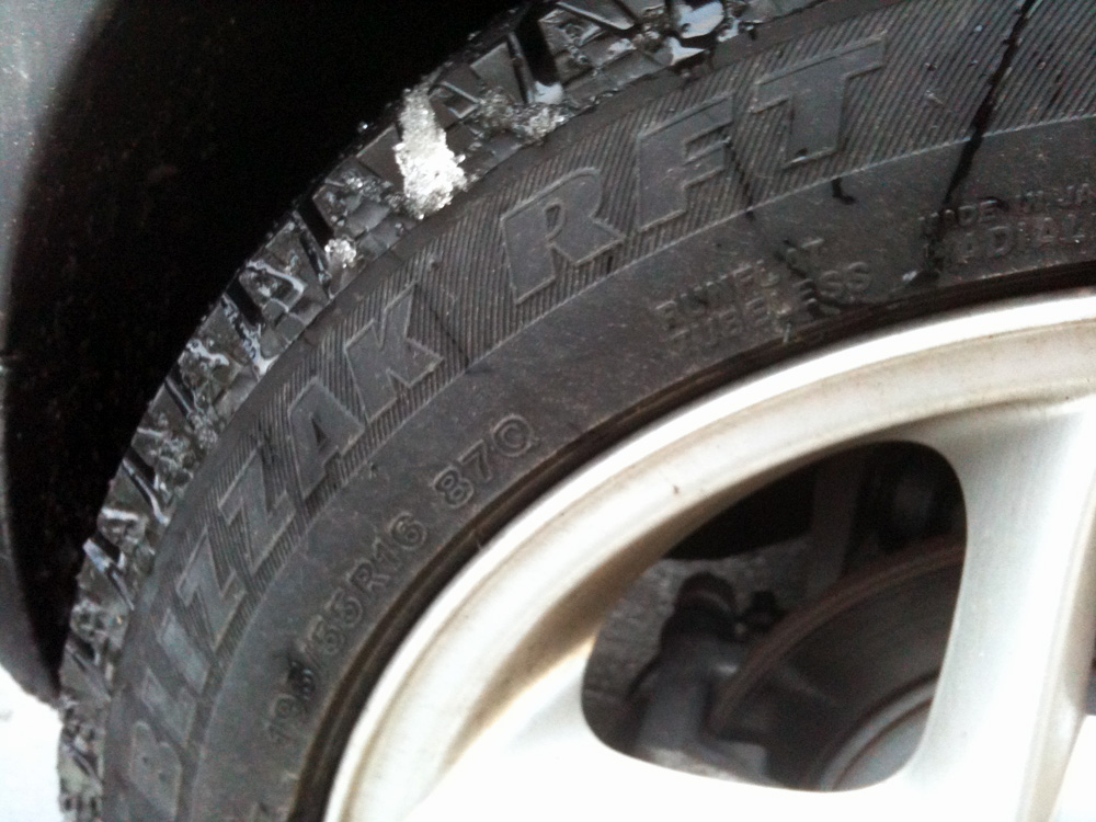 まず、驚いたというか『へぇ』と思ったのが、意外と普通にスタッドレスタイヤ性能アリ。『当然だろ』ってツッコミが入りそうですが、先入観として、サイドウォールが強化されている=全体の剛性が高いのにスタッドレス特有の弾力性を持ち合わせているよーな気がしないと思っていたんです。ところがどっこい、コイツはフツーに凍結路面も圧雪路面も難なく走ります。直接比較は無茶ながらも、たまたま実家のミニバンがBLIZZAKの最新タイヤ『REVO GZ』を履いていたので…それを思い出しながら運転してみても落胆するほどではありません。まぁ、あちらの方が性能は高いのは『当然』ですけど。つーか、大差あるなら販売できねーだろってツッコミ(以下略